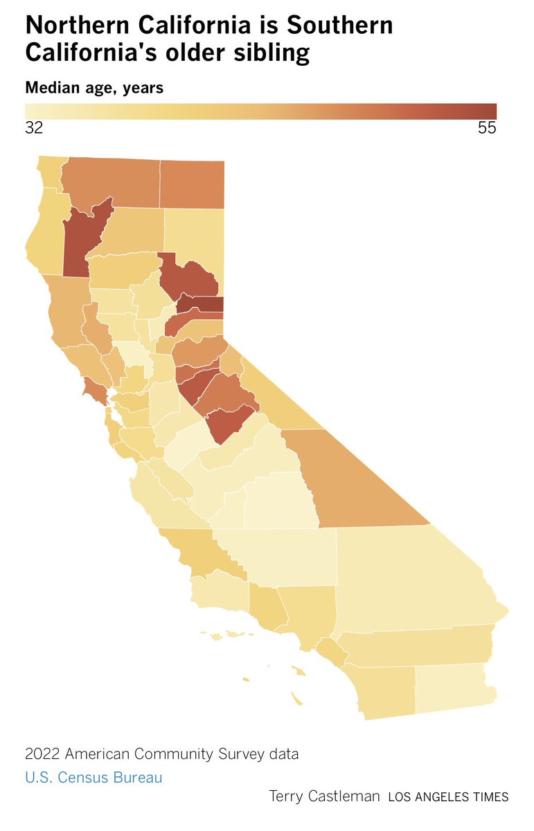 洛杉矶人口也逐渐老化了,十年来洛杉矶居民年龄中位数上升2.6岁,达到37.4岁。北加州人口老化比南加州严重多了。加州还是得靠移民增加年轻人口。 https://t.co/MQhxjDgNCW