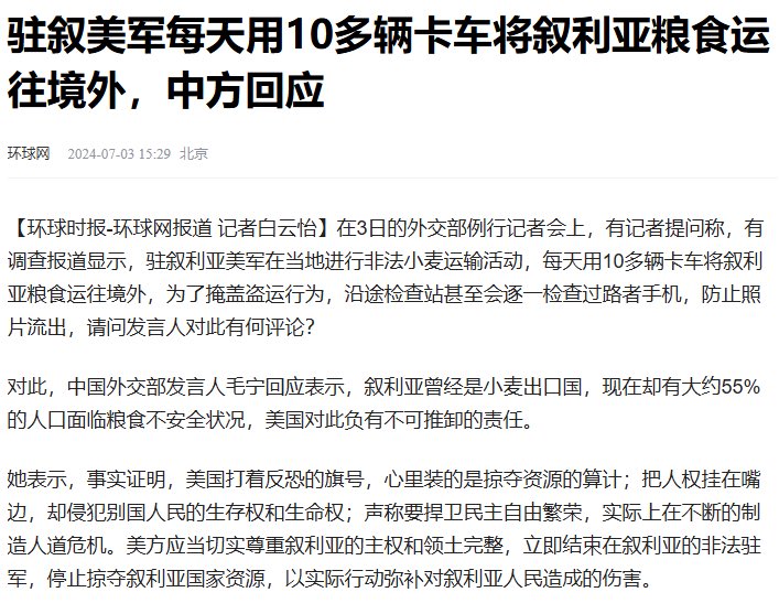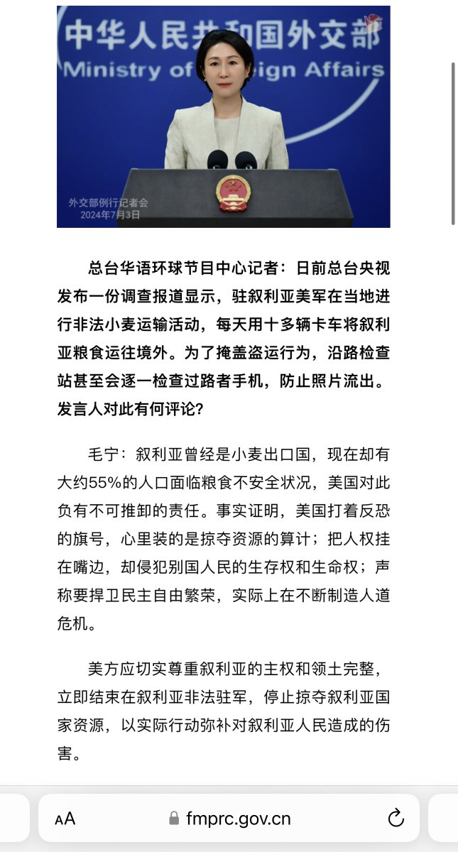 “美军偷叙利亚小麦”这个问题是中国外交部安排央视记者第一个问的,“调查报道”也是央视发的,目的就是为了让毛宁骂骂美国,环球时报报道时却不好意思说是央视记者,而成了“有记者”“有调查报道”,显得特中立似的。这么弱智的“调查报道”也就央视会做了。而且报道说的是“20辆卡车”,怎么缩水成“10多辆”? https://t.co/YVGivVZN2J