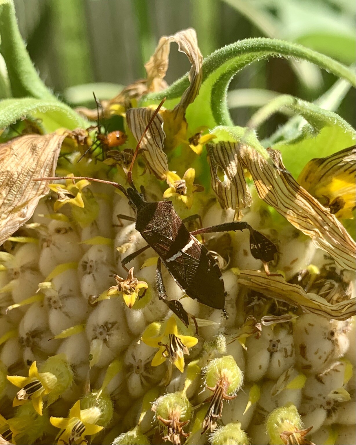 Leptoglossus phyllopus, Eastern leaf-footed bug adult and nymph on Helianthus annuus, Titan sunflower