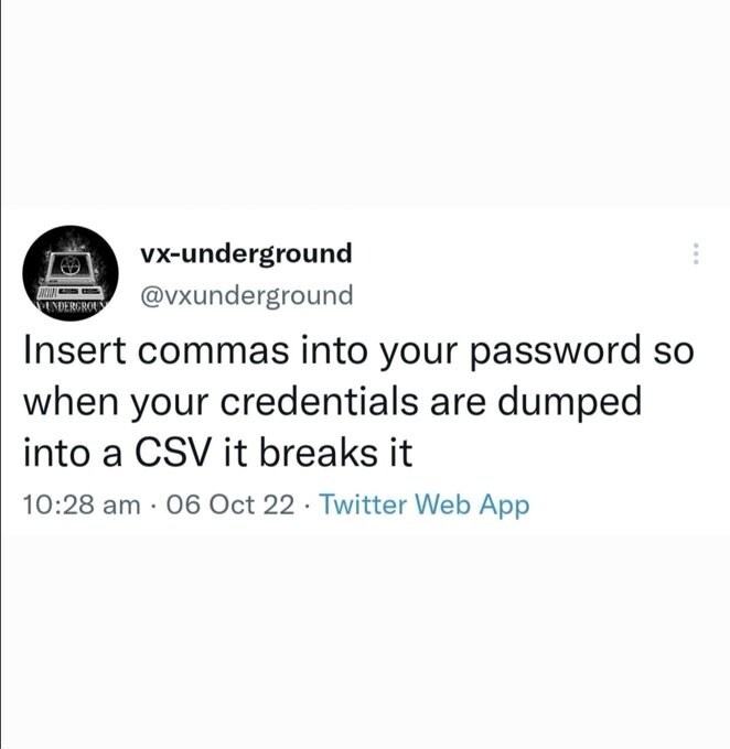 "Inclua vírgulas em suas senhas, de forma que, se sua senha for jogada em um arquivo tipo CSV, vai quebrar o arquivo!"