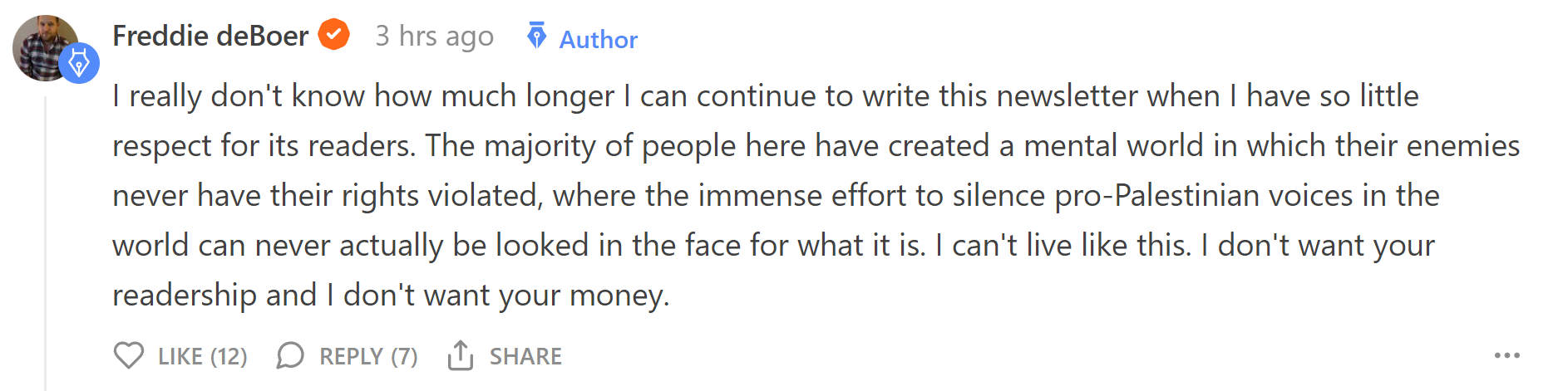 He made a post about how "If you actually believe in free speech then you should support Palestinians protesting in favor of Hamas" and most of the commenters (screaming hypocrites) replied "BUT THIS IS DIFFERENT!!"