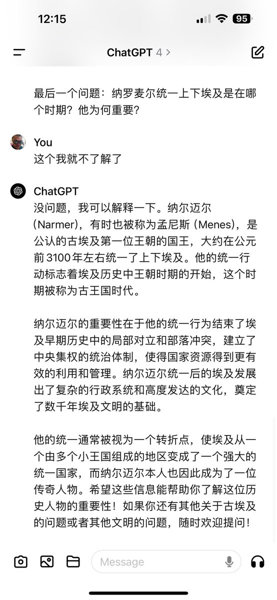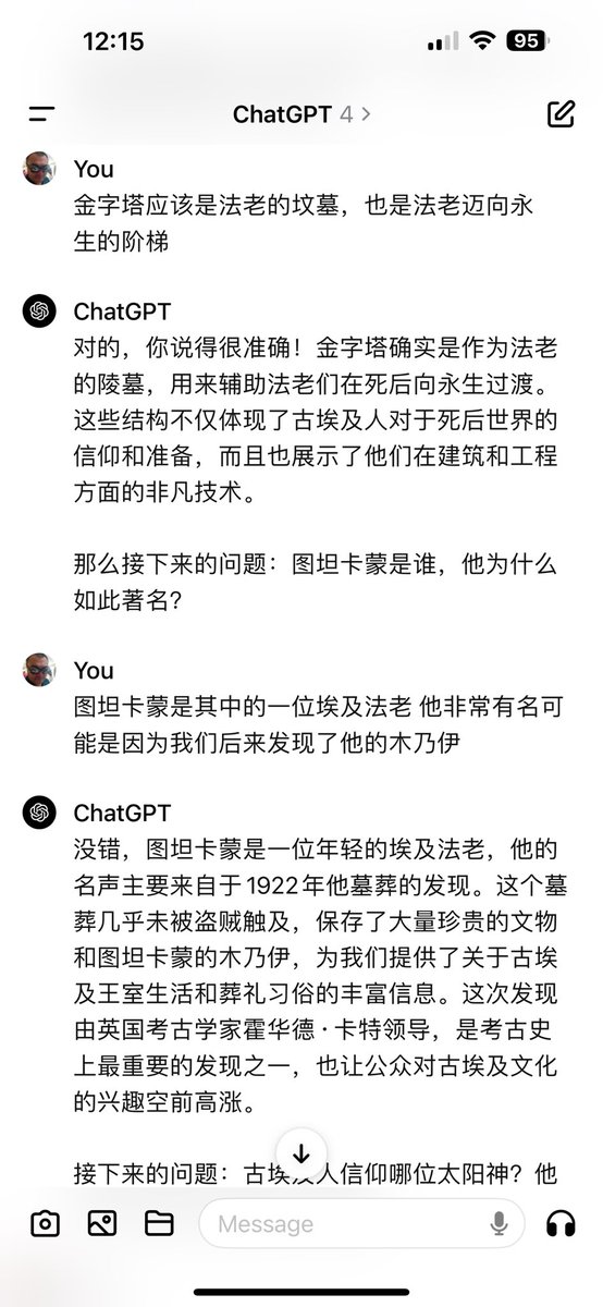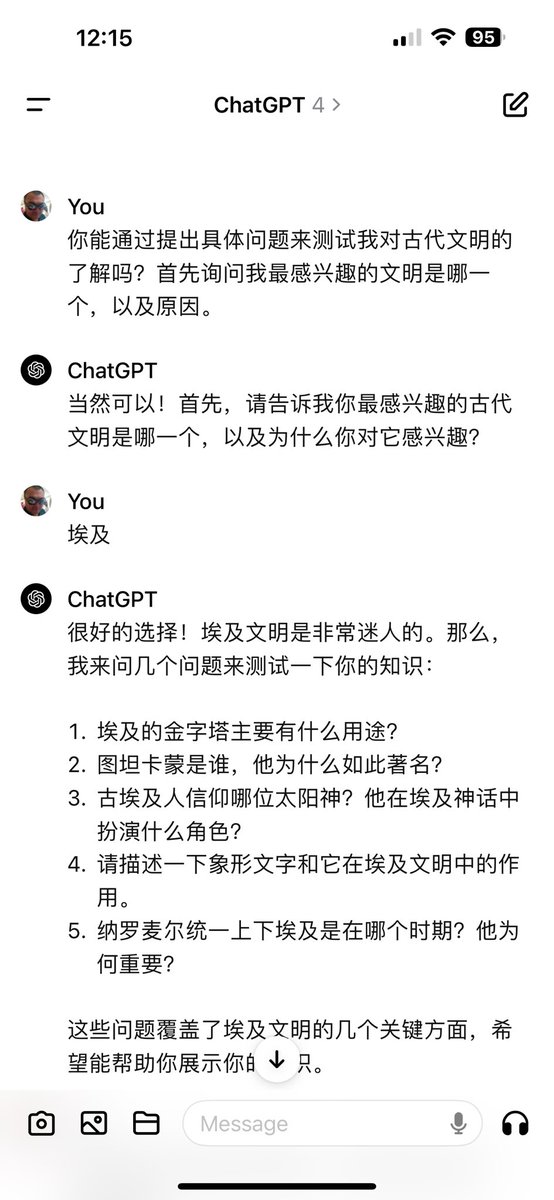 不是提问题来考ChatGPT,而是反过来让ChatGPT来考你,也蛮好玩的。看起来我对埃及还算比较了解。 https://t.co/4zzwFRCGqd