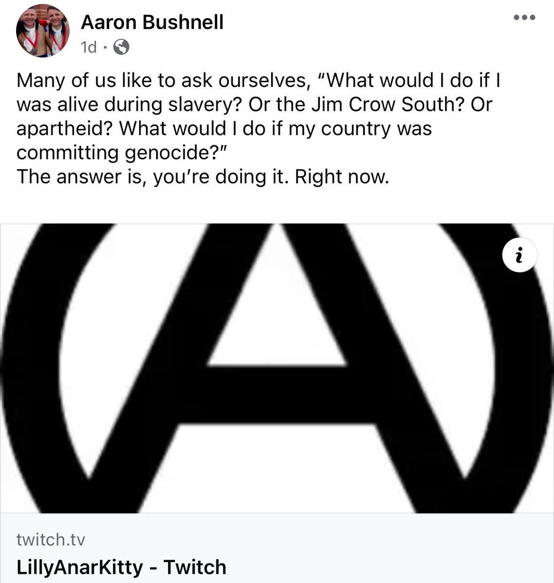 在自拍的视频中,他说:"我叫亚伦.布什内尔,我是美国空军现役军人,我不会再成为种族灭绝的同谋。