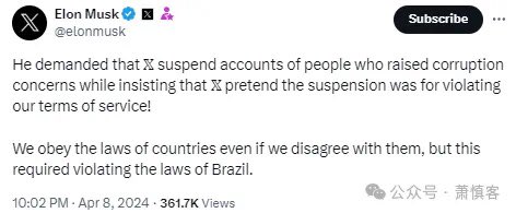 马斯克:"我们X公司的担忧是,我们被(巴西最高法院)要求做一些非法的事情,要求我们做直接违反法律的事情。我们被要求暂停那些账户并过滤掉内容,而且对此只字不提。假装暂停和区域封锁是由于我们的服务条款(TOS)造成的,但事实并非如此"。