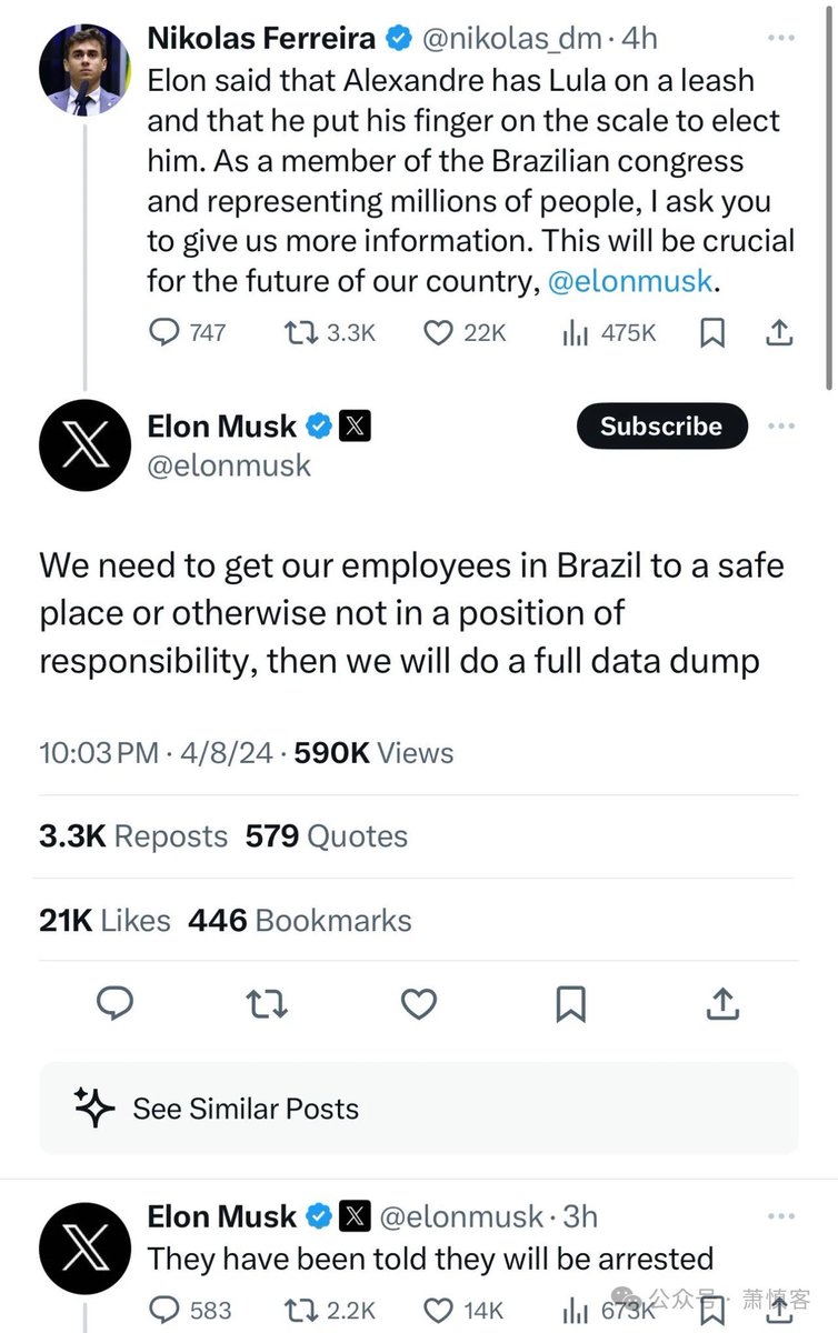 马斯克警示,由于巴西领导层继续攻击言论自由,X公司在巴西的员工拒绝向巴西政府解密部分敏感账户内容等,已被告知他们将被逮捕。