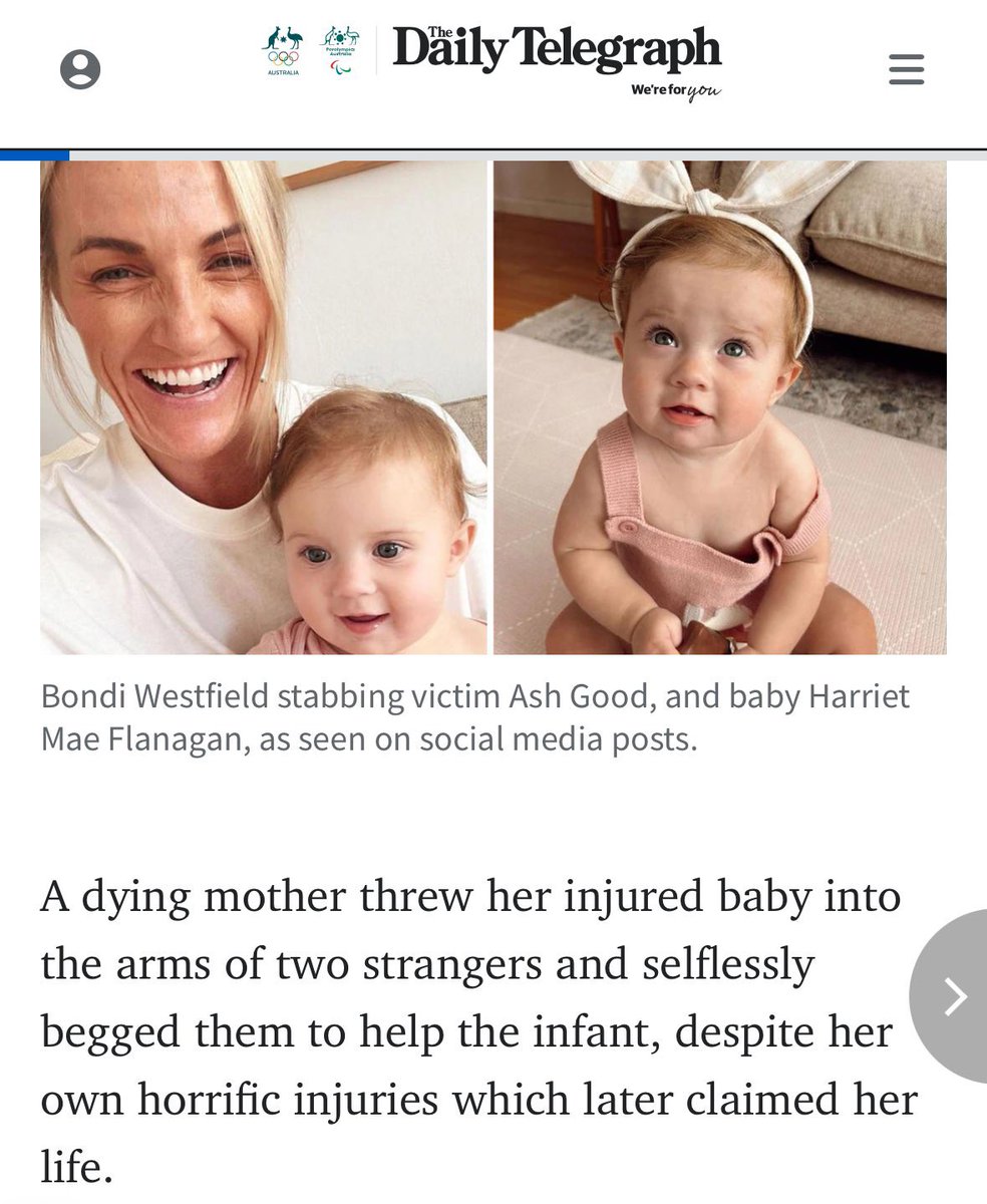 今天,澳大利亚悉尼的韦斯特菲尔德(Westfield)购物中心,初为人母的骨科医生阿什·古德(Ash Good)正推着她九个月大的女儿哈丽特(Harriet)到达邦迪路口(Bondi Junction)时,在光天化日之下,持刀歹徒靠近购物车,刺伤了女婴,然后他又刺杀她。