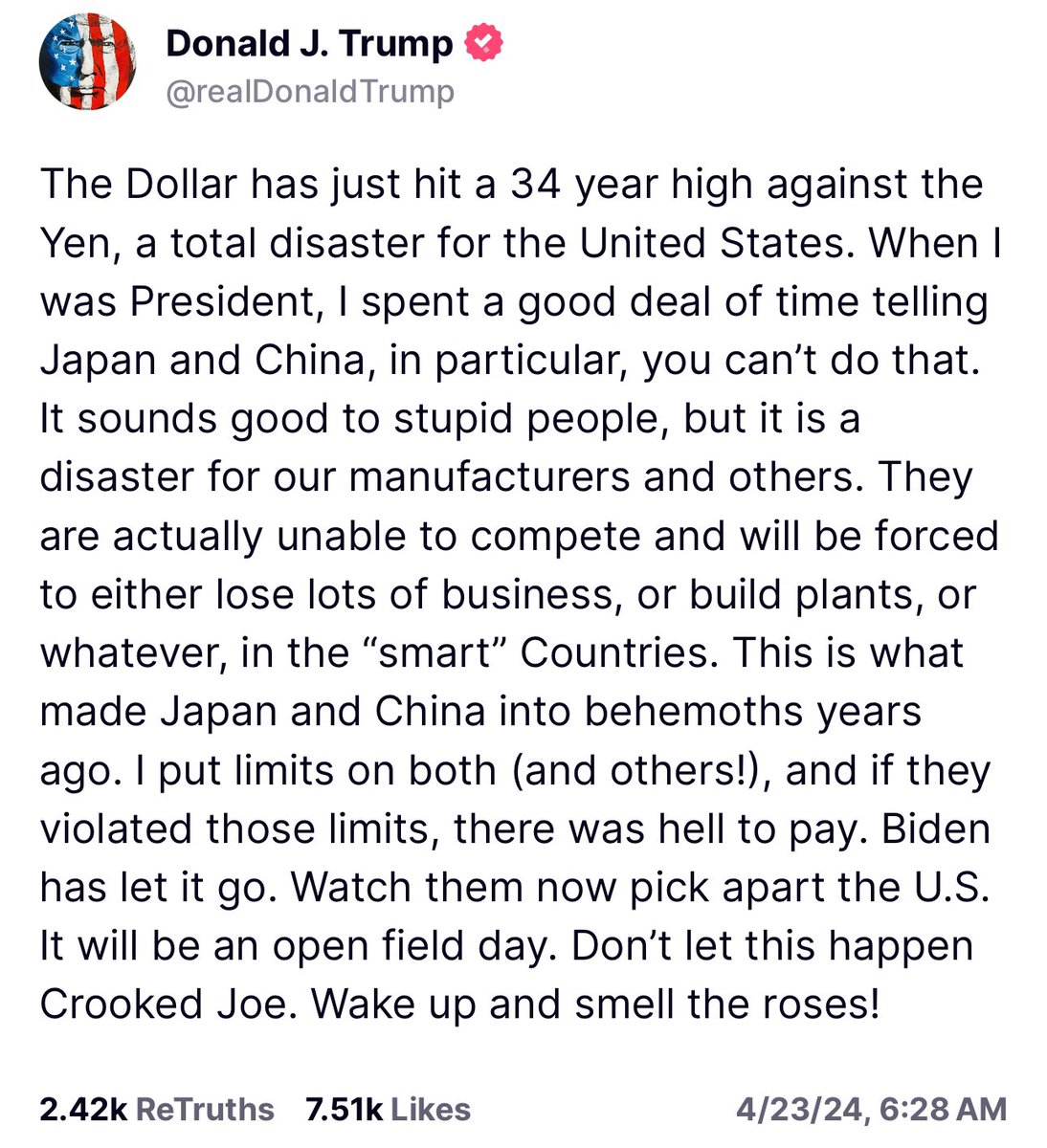 川普今天一早的信息:美元兑日元刚刚创下 34 年来的新高,这对美国来说简直是一场灾难。 当我担任总统时,我花了大量时间告诉日本和中国,你们不能这样做。 这对愚蠢的人来说听起来不错,但对我们的制造商和其他人来说却是一场灾难。 他们实际上无法与之竞争,将被迫失去大量业务,或在 "聪明 "国家建厂或做其他事情。 这就是多年前让日本和中国成为庞然大物的原因。 我对这两个国家(以及其他国家!)施加了限制,如果他们违反了这些限制,就会付出惨痛代价。 拜登却听之任之。 现在就看他们如何挑剔美国吧。 不要让这种情况发生,骗子乔。 醒醒吧,闻闻玫瑰花香!