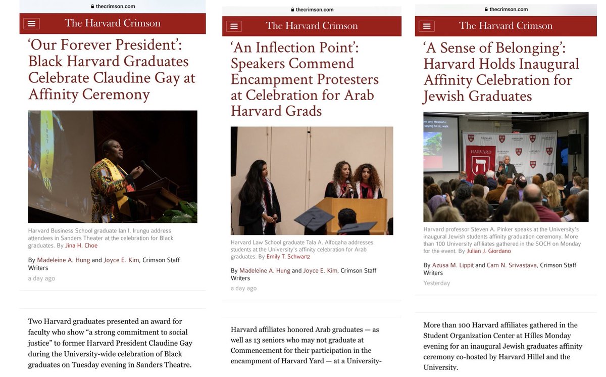 ⏺️ 分成不同的毕业典礼:我们有了 "犹太裔哈佛毕业生"、"阿拉伯裔哈佛毕业生 "和 "黑人哈佛毕业生",而不是 "哈佛毕业生"。 这种分裂与哈佛的校训截然不同。