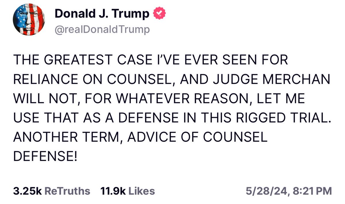 川普今晚的TS帖:这是我见过的关于依赖律师的最好案例。不管出于什么原因,梅尔坎法官都不会让我在这场被操纵的审判中,以此作为辩护的理由。另一个术语,辩护律师的建议! https://t.co/RQTTL2FDJl