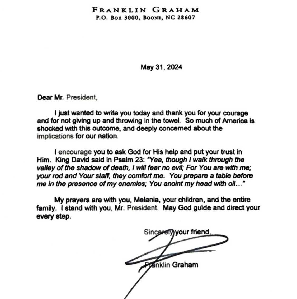 布道家葛福临牧师给川普总统写了一封支持他的信。其中用《圣经》经文鼓励川普。全文如下: