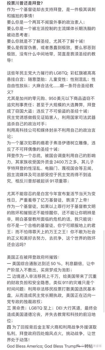 以前,我会说如果拜登赢得大选,对美国并不构成威胁。现在,我认为这是危险的。”
