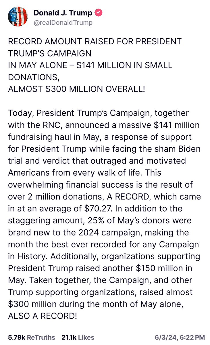 ⏺️川普的TS帖:为川普总统竞选筹集的资金创下纪录!