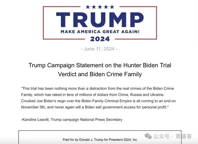 川普竞选团队国家新闻秘书卡洛琳·莱维特写道:“这次审判只不过是分散人们对拜登犯罪家族的真正罪行的注意力,该家族从中国、俄罗斯和乌克兰获得了数千万美元。”