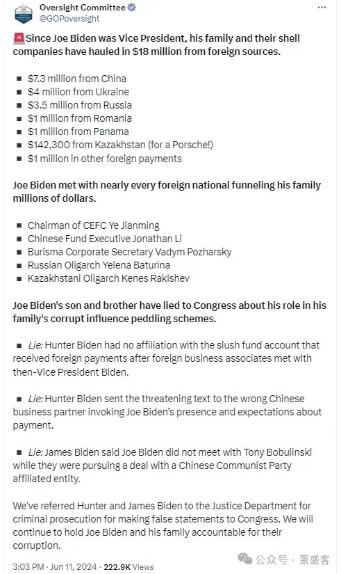 “狡诈的乔·拜登对拜登家族犯罪帝国的统治将在11月5日结束,拜登再也无法为了个人利益而出卖政府了。”