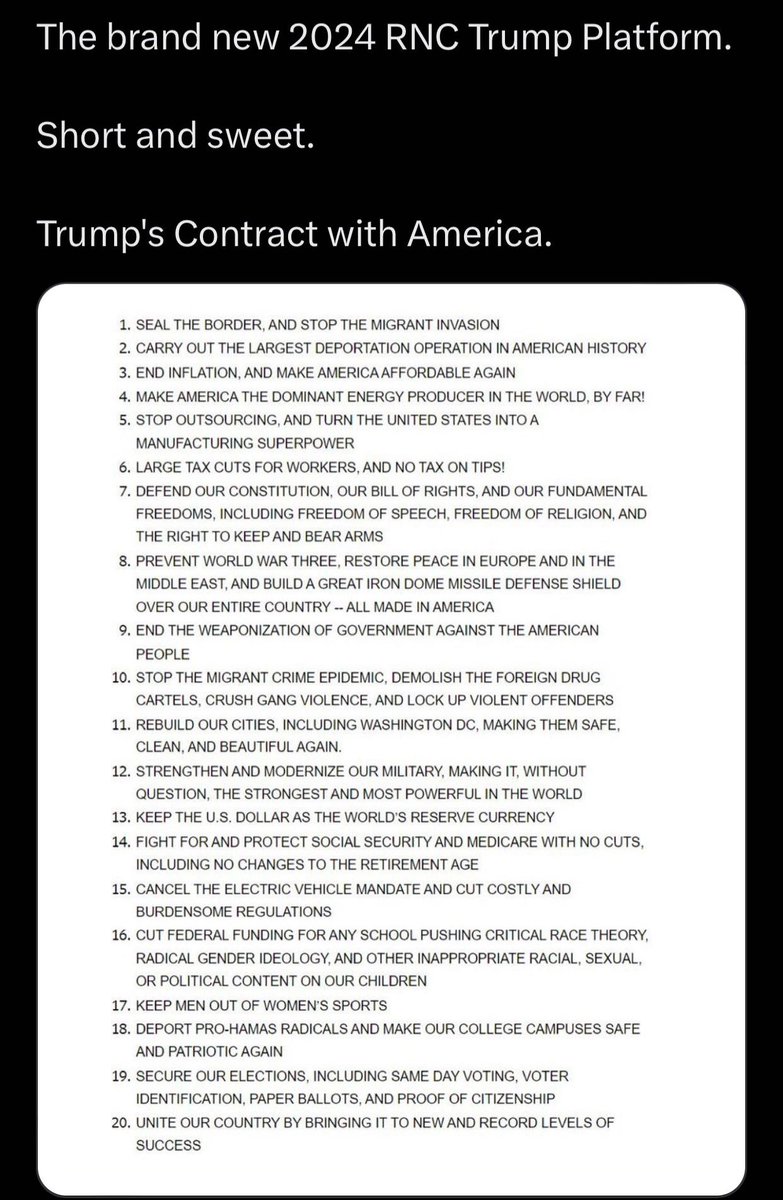 【共和党政纲】07/08/2024周一,共和党全国委员会发布 "2024 年共和党政纲,让美国再次伟大"。灵感来自川普对美国的愿景。