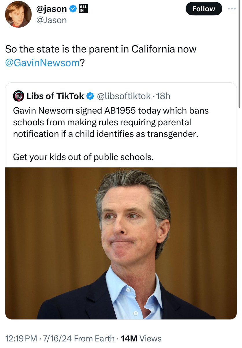 ⏺️杰克(原推特CEO)的跟帖:所以现在在加州,州政府才是父母 @加文·纽森?