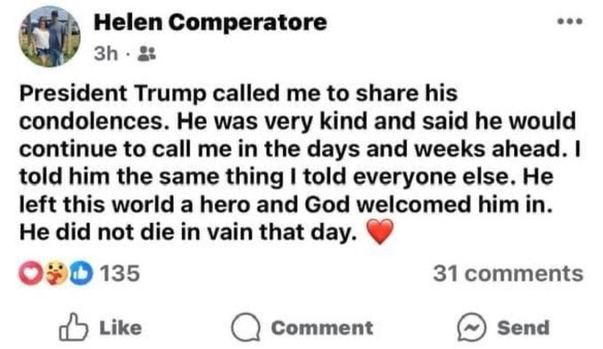 科里·康佩拉托雷的遗孀Helen在丈夫于宾夕法尼亚州集会上遭枪击后接到了川普总统的电话。