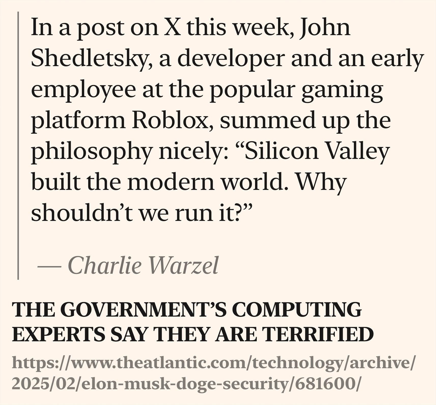 The hubris of these tech bros who think knowing a lot about computers makes you somehow qualified to run the world. This man helped build a children's game. That's his qualification. God help us.