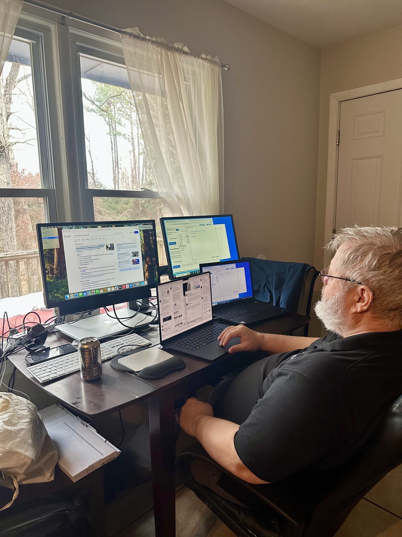 This is my new world headquarters Mission Control center, overlooking my bird filled back yard and adjacent woods. Now I can write two blog posts at once!