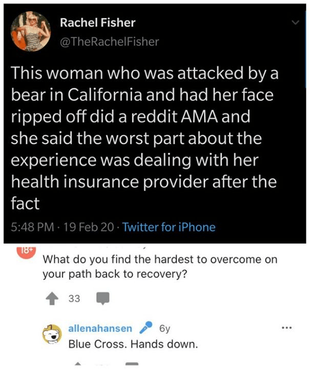 Imagine surviving a bear attack where your whole face gets ripped off and the worst part of the experience is Blue Cross and Blue Shield. This is why people have sent Luigi $300K