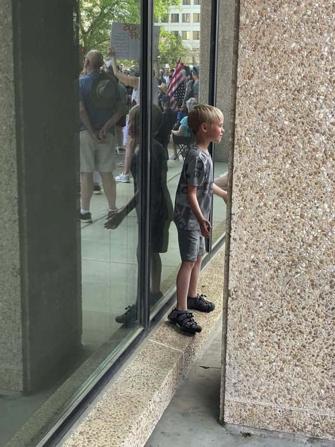 In Winston Salem, North Carolina, James, my six-year-old grandson attended his first protest today. Meanwhile, in Gainesville, FL, two of my older grandsons got to experience the one being held here.