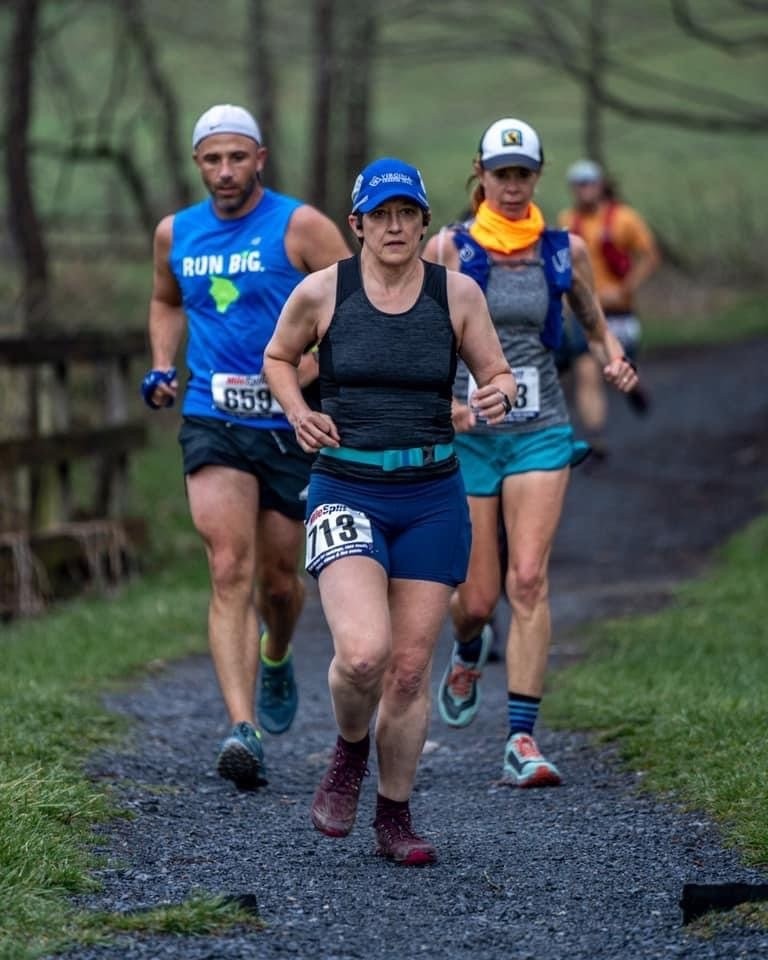 Wonder Woman racing on the Virginia Creeper Trail. See that black gravel at her feet? She has bits of it permanently lodged in her hands and knees from her frequent falls while running there.