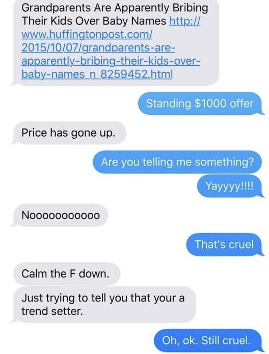 I've been trying to get one of my kids to name a grandchild after me for 20 years. Now, my daughter has got jokes.