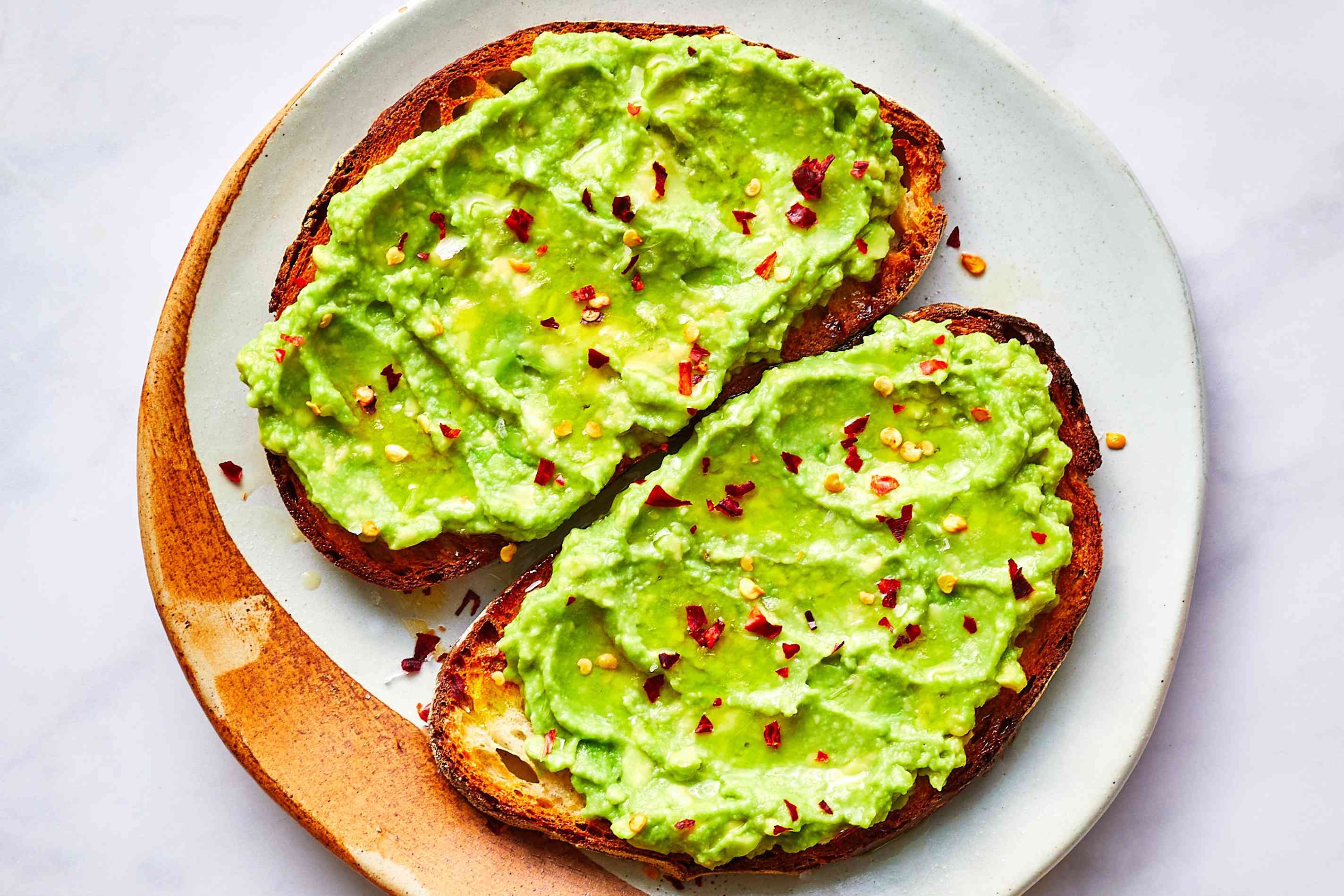 Lou's Avocado Toast • 1 slice of whole wheat bread • Half an avocado thinly sliced • Olive oil to taste • Red pepper flakes to taste • Black sesame seeds • 1/4 to 1/2 tsp Kosher salt • Fresh ground black pepper