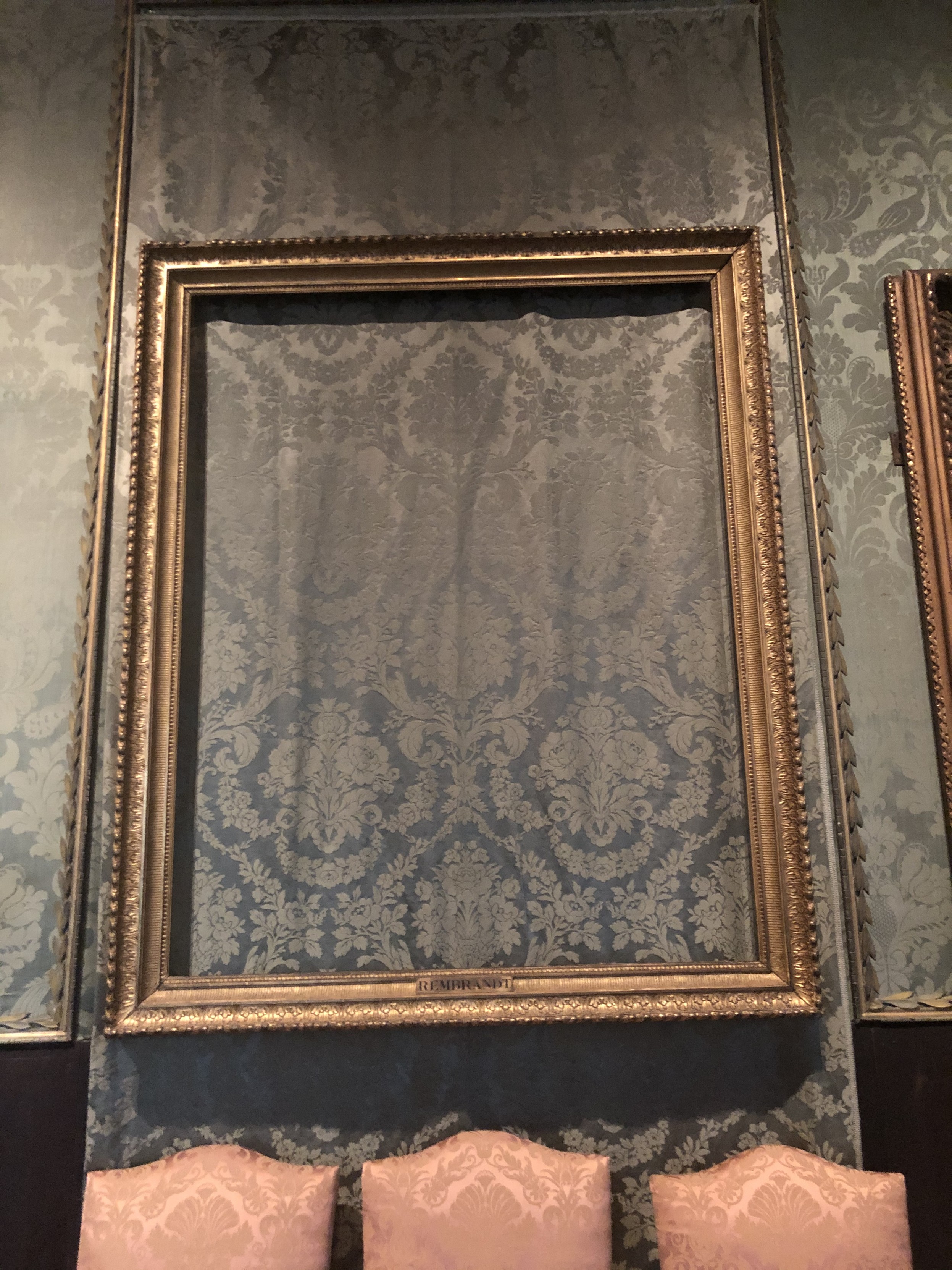 My son sent me this photo from his visit to the Isabella Gardener Museum in Boston. The frame once held Rembrandt's "Storm on the Sea of Galilee" until it was stolen along with several other pieces in 1990.