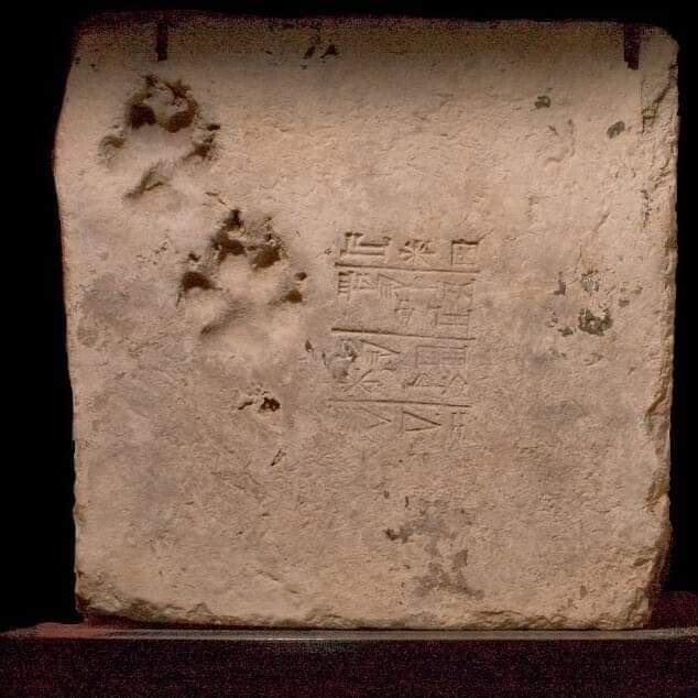 More than 4,000 years ago, a dog left his (or her) front paw marks on this clay brick while it was lying out to dry.