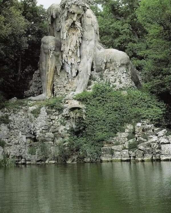 Just North of Florence, Villa Demidoff, Italy; stands Appennino Colossus, 35ft tall. Erected in 1579 CE, rough idea for sculpture is to combine landscape and man; smooth skin emerging out of rough terrain or metamorphosing back into mountain. He even has stalactites for shaggy beard.