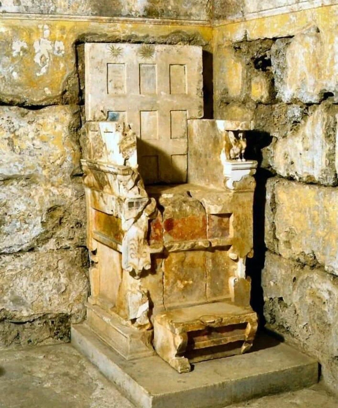 Throne was found in another royal tomb close by tomb of Eurydice I by K. A. Rhomaios in 1938. It was in pieces, but has since been reconstructed and it has sphinxes as supporters for both arm rests and also royal Macedonian starbursts at head of its back panel.