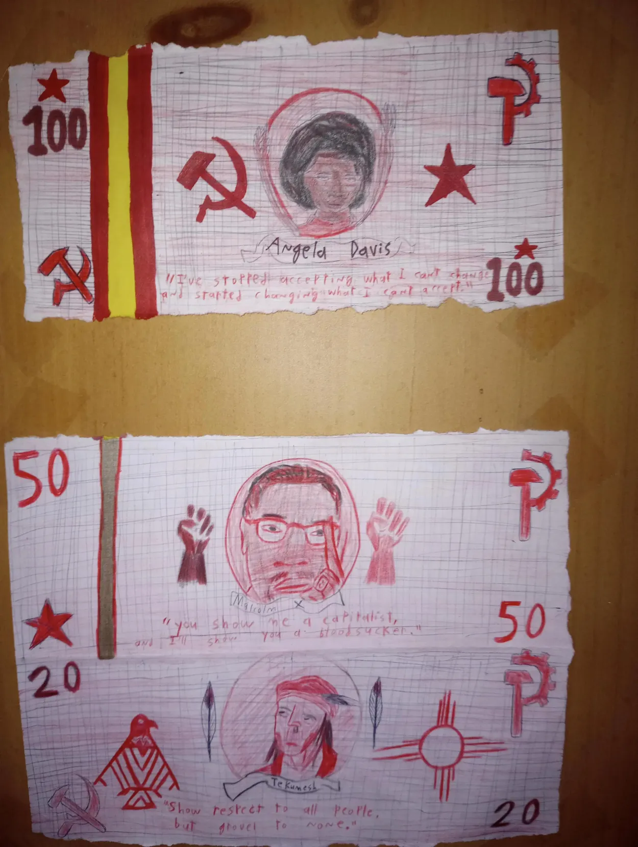 Reddit commie designs post-revolution currency crayon drawings for mom to put on the fridge. :marseyxd: https://old.reddit.com/r/TheDeprogram/comments/12i5q3h/my_idea_of_what_money_might_look_like_after_the?context=8