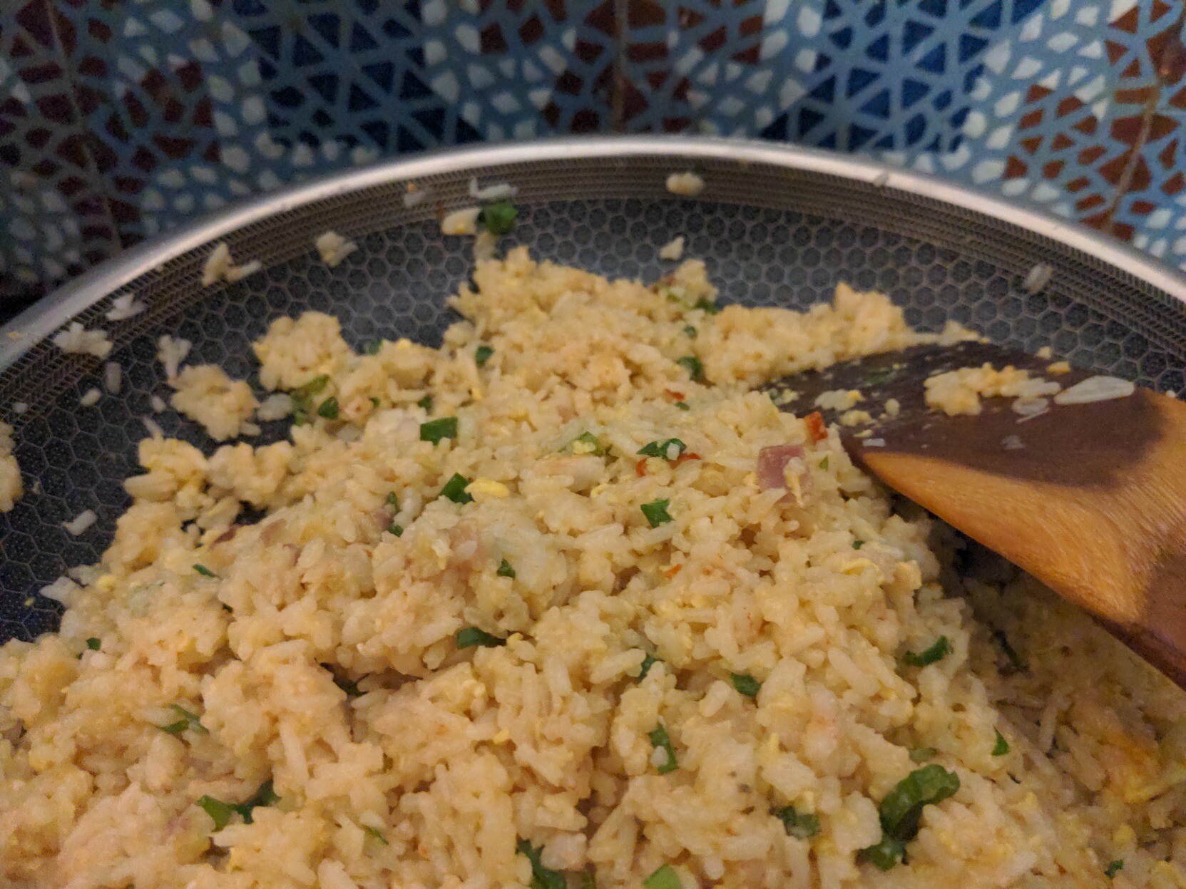 After a small hors d'oeuvre of steak bites, the breakfast dish in our emergency cook-off is shrimp fried rice with a sneaky pancetta twist.