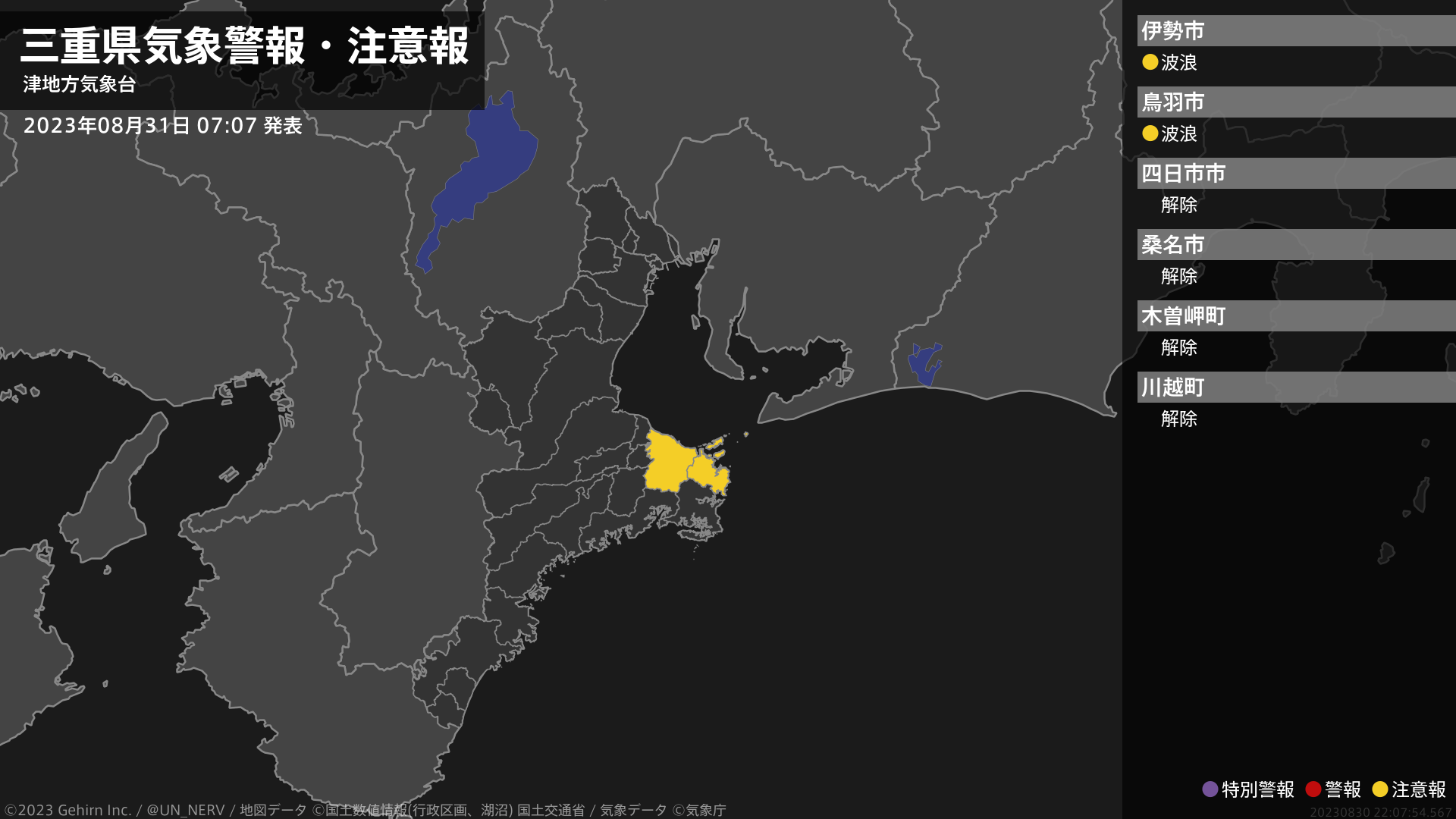 【三重県 気象警報・注意報 2023年08月31日 07:07】