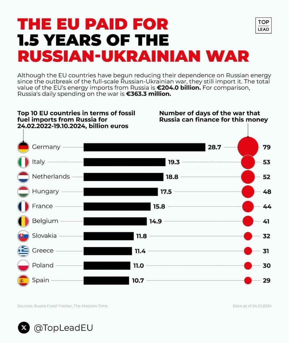 自 2024 年 2 月 24 日起,到10月19日🇪🇺国家已为购买俄罗斯能源支付了€ 2040 亿。平均每天超过8.5亿欧元,而俄罗斯为侵略乌克兰的战争所需支付的不会高于3.6亿欧元/每天。