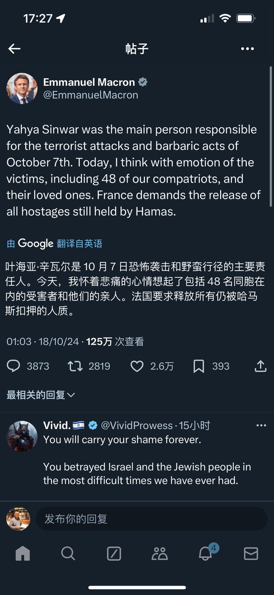 法规总统马克龙只字不提以色列,不知道的还以为是他马克龙指挥法国军队斩首的叶海亚·辛瓦尔。 https://t.co/OhJ62cZPVk