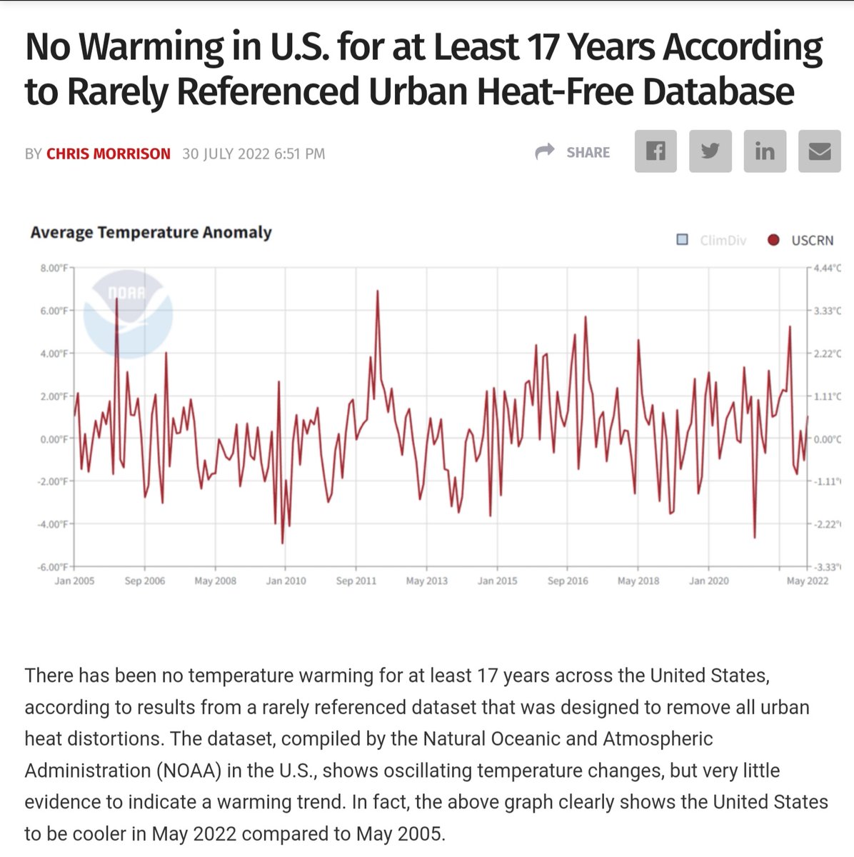 RT by @jordanbpeterson: NOAA replaced its US network of temperature guages across the lower 48 states in 2005, so it no longer has to adjust readings for older, outdated or badly placed monitors. Since then there has not been any rise in temperatures. This is a devastating blow for the UN climate scam.