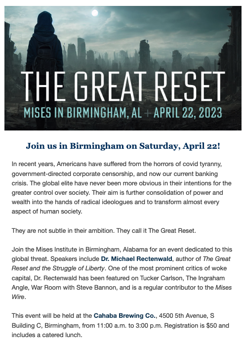 Event with Michael Rectenwald @GreatResetProf April 22 Birmingham Alabama on the Great Reset: be there or be square.