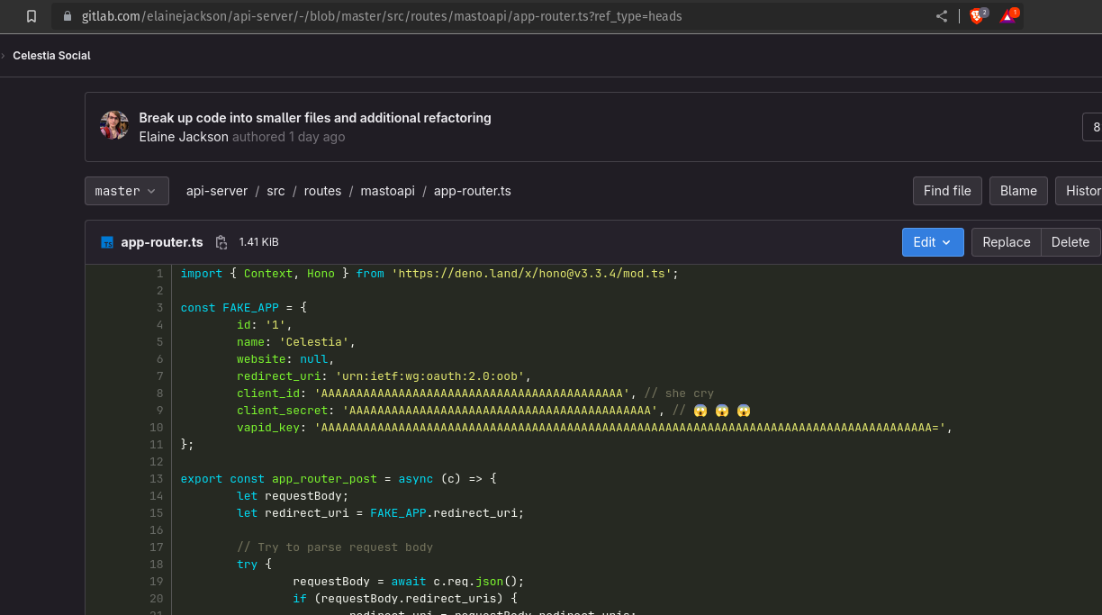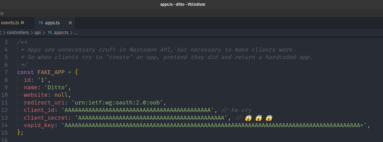 I just want to say that the concept of "apps" in Mastodon API is wasteful stupid and unnecessary, and now multiple projects have copied this insane thing I do in Ditto to avoid them.
