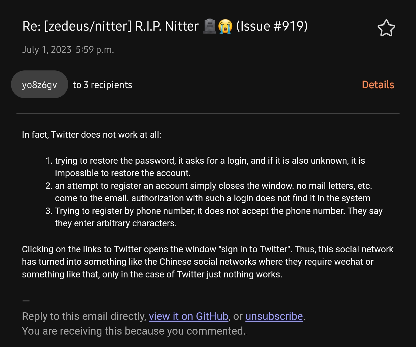 well, looks like twitter actually did kill nitter. as of a few minutes ago its throwing errors viewing any tweet or account