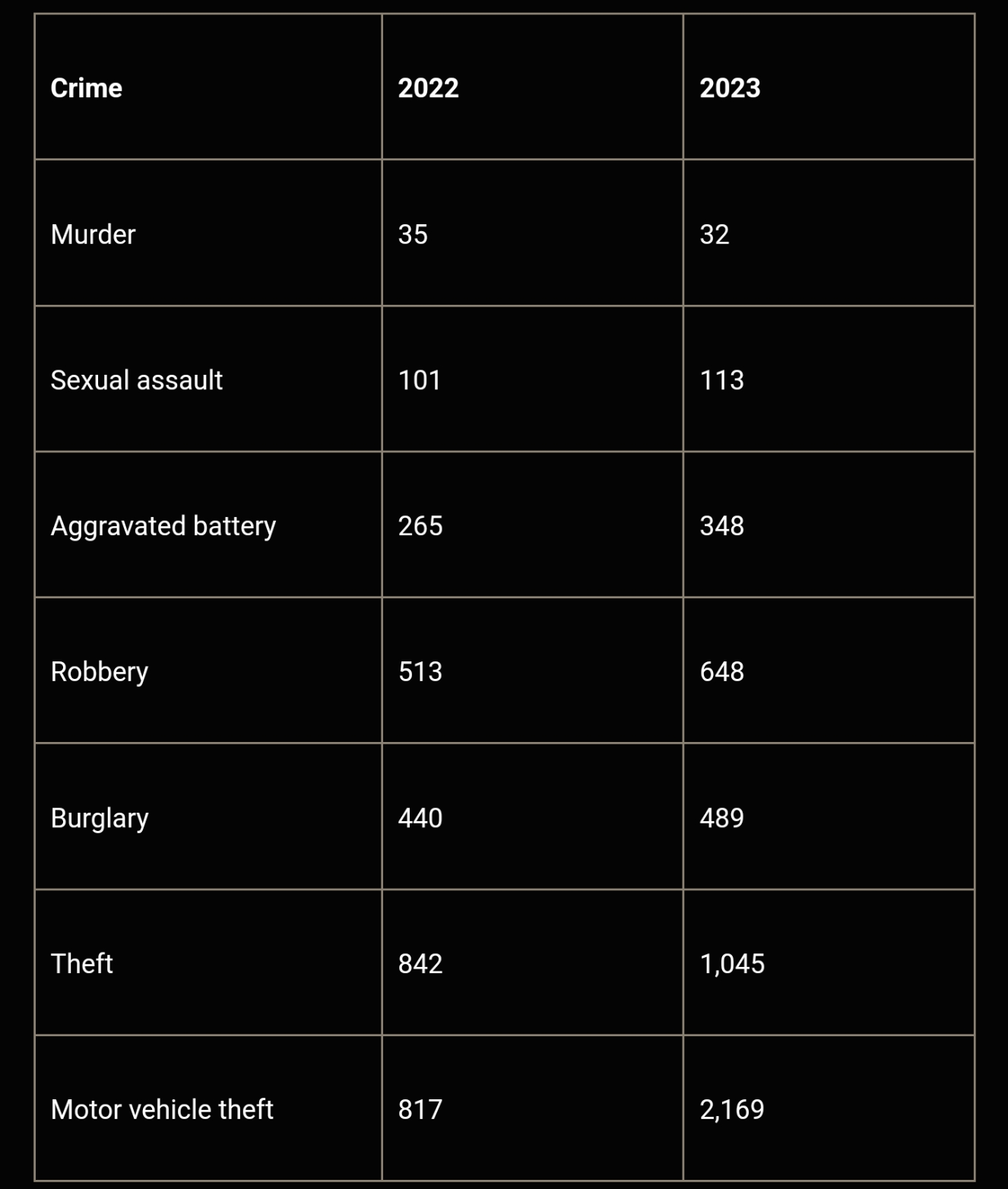 The overall crime rate is 7,573 crimes per 100,000 people, indicating a 1 in 13 chance of becoming a victim of any type of crime