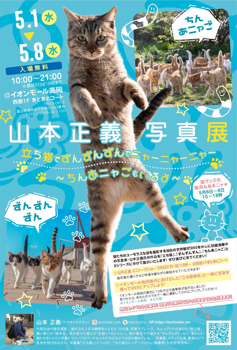 撮影する独自の世界観がSNSを中心に話題沸騰中の写真家・山本正義氏の作品を「立ち猫」、「ずんずんずん」、「ちんあニャご」と3シリーズに分けて展示いたします! ぜひ遊びに来てください!