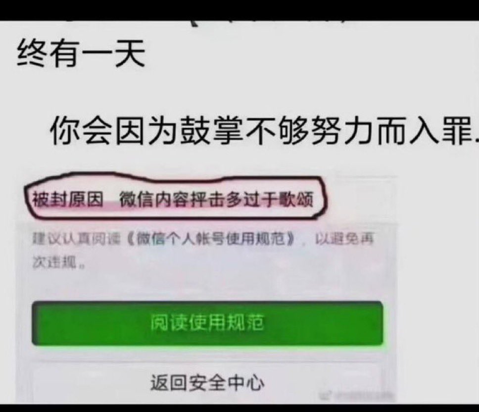 🔥 微信帐号因为“内容抨击多过于歌颂”而被封!再往后就是“没有全面歌颂”而被封!接着会是“歌颂态度不诚恳”被封!总有一款封杀你的缘由…… https://t.co/vcyM536Pan