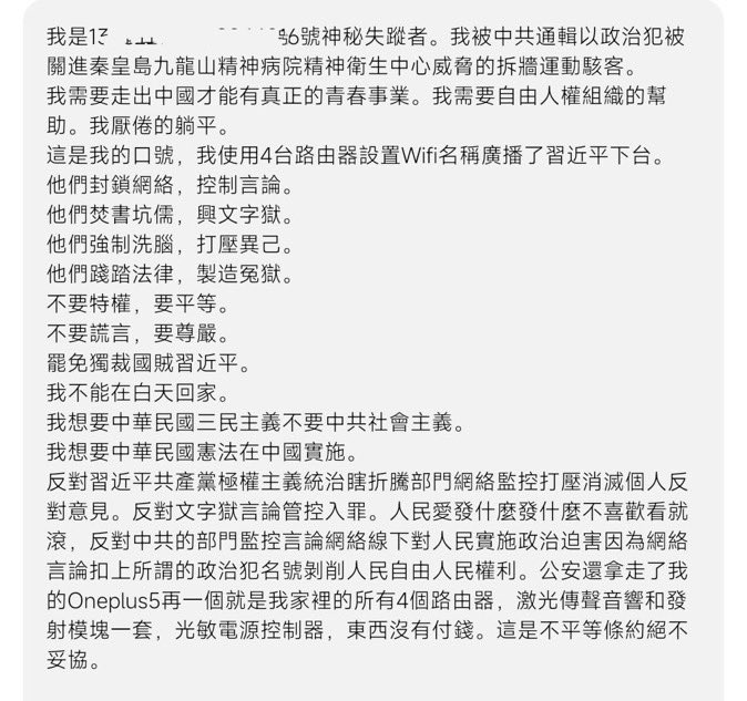 🔥 转自Suyutong:这名冲塔年轻人名叫闫中健,来自河北省秦皇岛昌黎县某镇。与大多中国人的麻木和岁静不同,他很早就翻墙上网并并注社会公共事务,也曾声援香港反送中运动,认同台湾的民主价值和理念,也一直挞伐中共和习独裁政权。