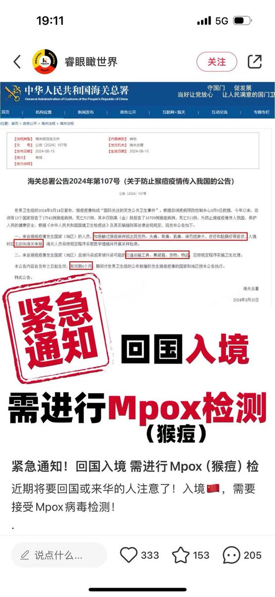 🔥 转:近期将要回国或来华的人注意了!入境,需要接受 Mpox病毒检测!