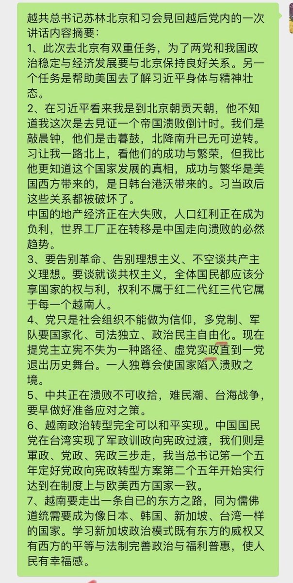 🔥【爆笑】弧度度:越共中央总书记苏林内部讲话曝光,其远见卓识堪称独树一帜,为社会主义的成功转型指明了方向,非死抱马列主义不放的X龘龘所能及也! https://t.co/K351cIKGKK