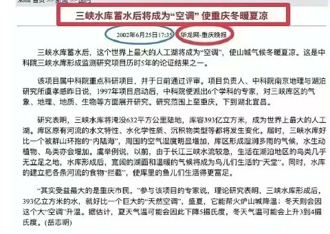 【图一】重庆晚报在2002年6月发布了一篇关于三峡大坝的媒体宣传:三峡水库蓄水后将成为“空调”,使重庆冬暖夏凉!