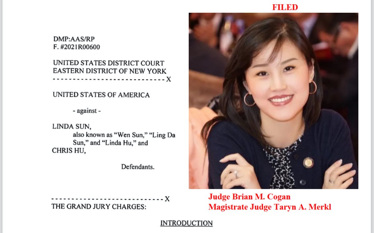 今天早些时候,在布鲁克林联邦法院,一份起诉书被解封,指控琳达·孙(Linda Sun,孙雯)违反并共谋违反《外国代理人登记法》,签证欺诈,偷渡外籍人士,以及洗钱阴谋。孙被指代表中华人民共和国政府(“PRC”)和中国共产党(“CCP”)行事。孙的丈夫兼共同被告克里斯·胡(Chris Hu)也被指控参与洗钱阴谋,以及共谋银行欺诈和滥用身份识别手段。