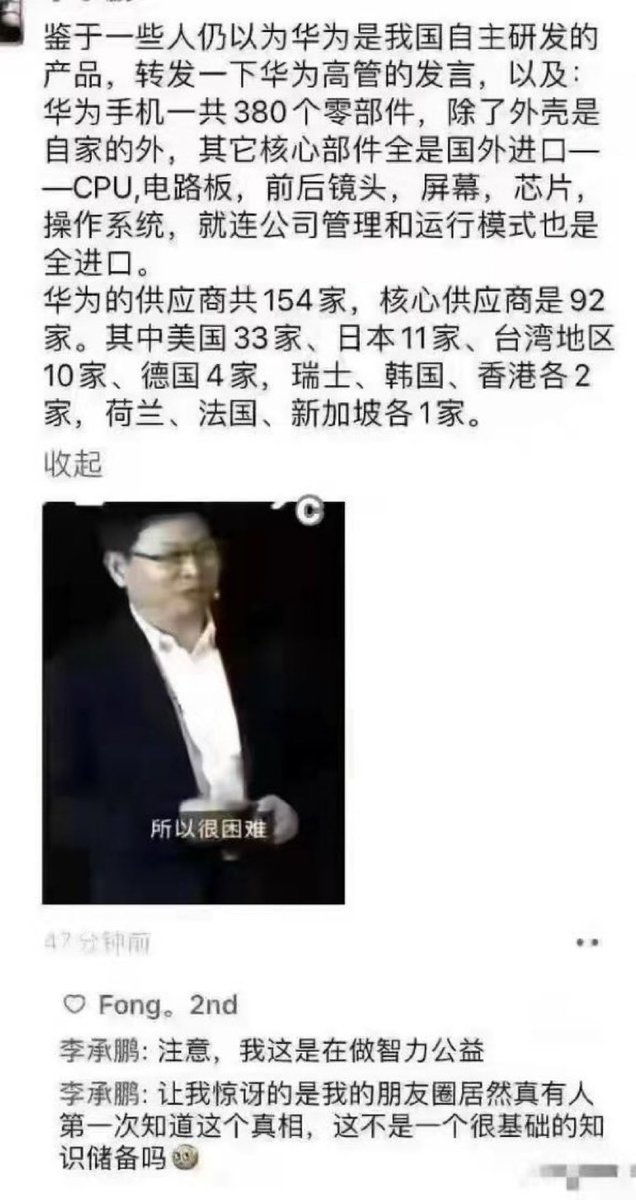 👉这个被吹上天遥遥领先的华为手机,一共380个零件,除了外壳是自己的外,其它核心部件全是国外进口的。